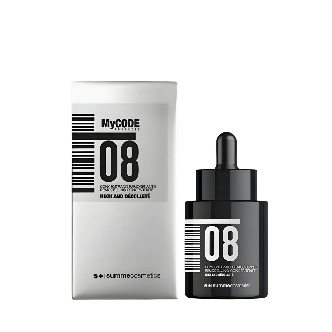A Summe Cosmetics MyCODE Advanced 08 REMODELLING CODE NECK & DÉCOLLETÉ CONCENTRATE egy fejlett, célzott hatású koncentrátum, amely a nyak és dekoltázs bőrének feszesítésére, tömörítésére és kontúrjának újraformálására lett kifejlesztve.
