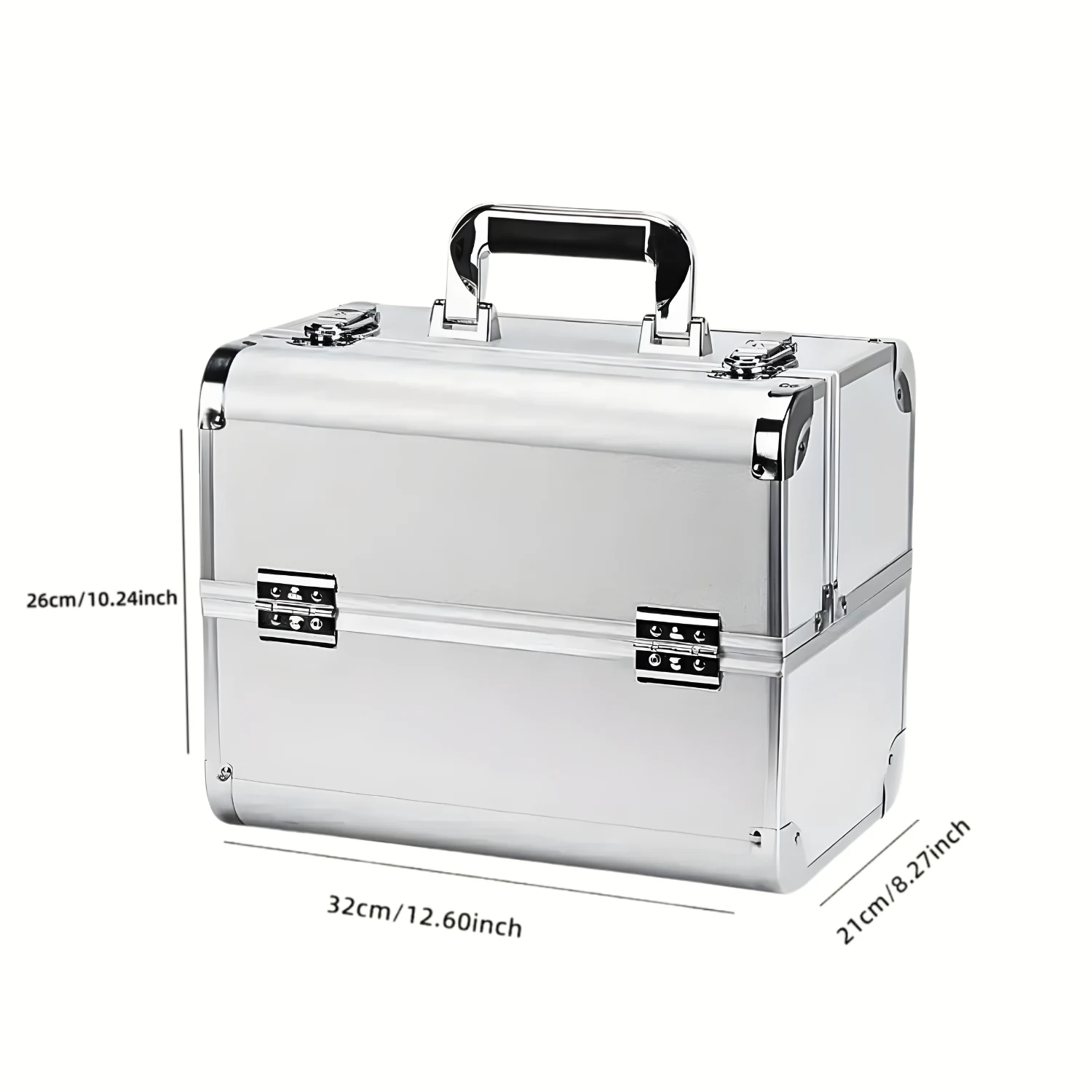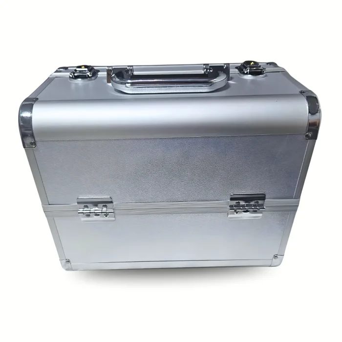 Ezüstszínű kozmetikai és sminkes bőrönd professzionális felhasználásra. Alkalmas sminkesek, kozmetikusok és műszempilla-építők eszközeinek tárolására és szállítására.